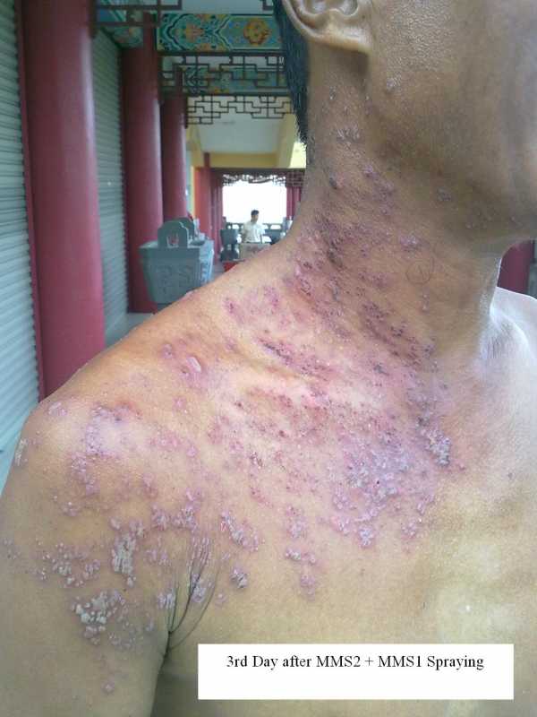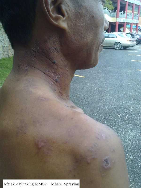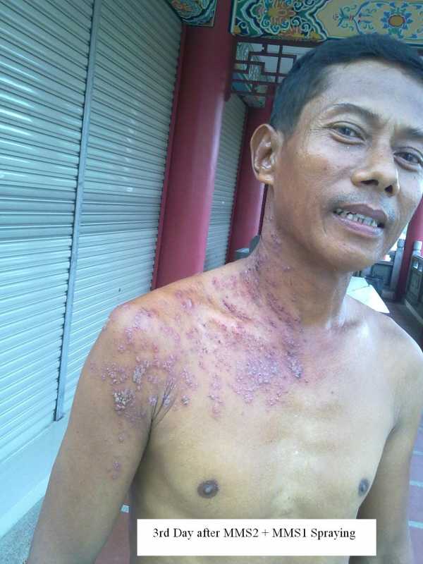 I begin with letting him taking MMS2 orally for 4 times, one cap every 2 hours on day one. The next day he told me his pain is gone, so I ask him to continue taking MMS2 at the same dosage. At the same time I bring the activated MMS1 10 drop spray to spray on his skin area.